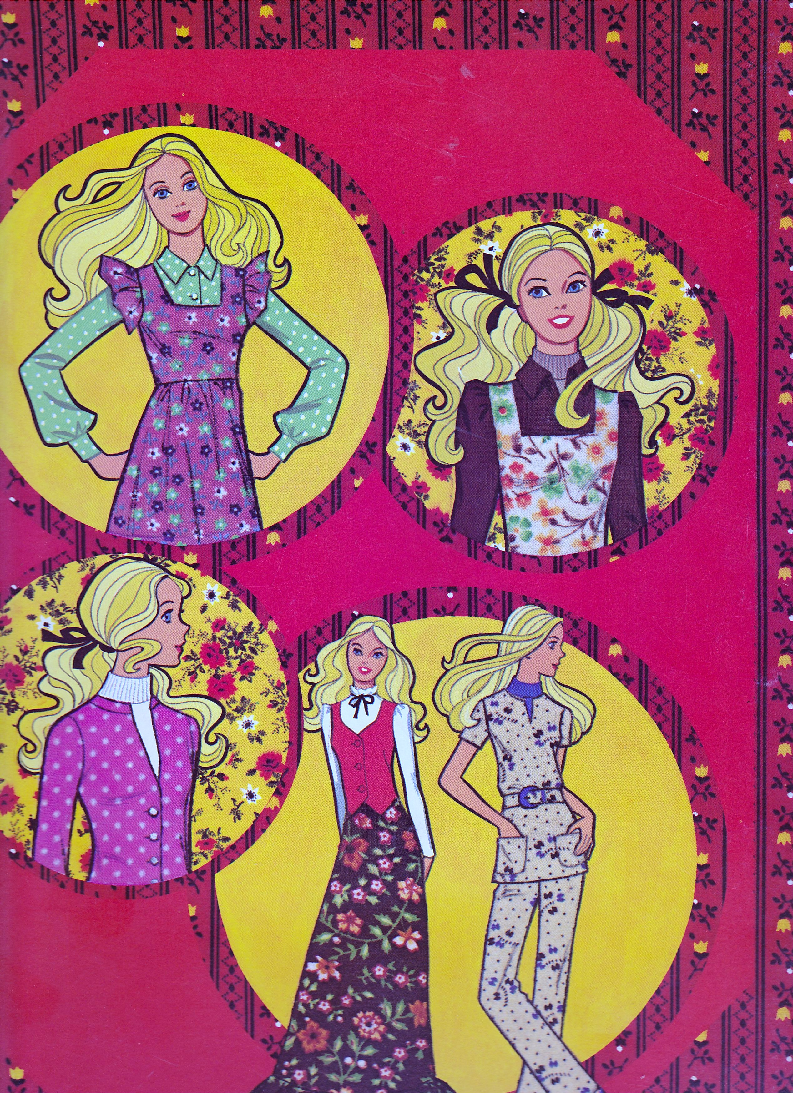 The Calico Cathy paper dolls are from 1976, the height of the “prairie” trend in 1970s fashion. I remember my fellow first-grade girls wearing sunbonnets and long skirts and Little-House braids around this time. Calico Cathy takes things further–even her pantsuits are calico. Well, I guess that’s how she earned the name Calico Cathy.