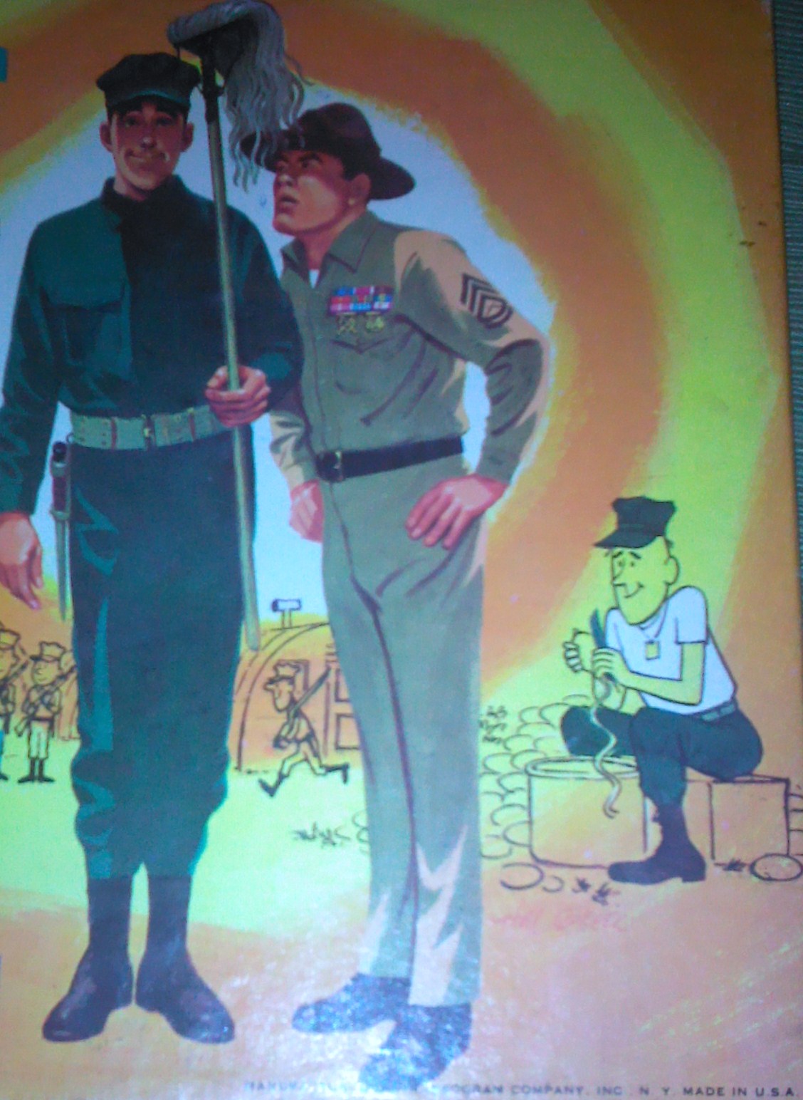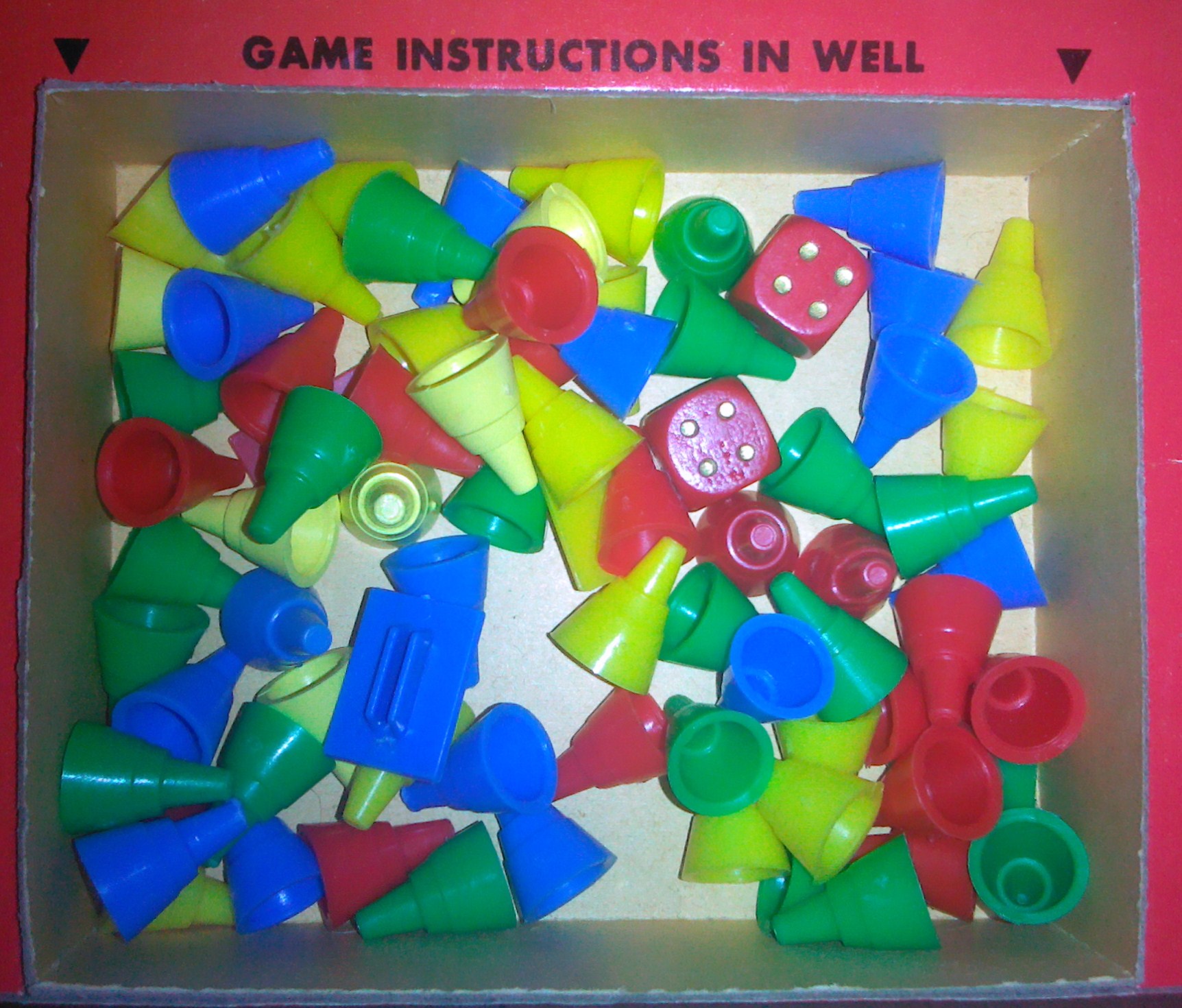 Game Play: No clue. See the well that holds the plastic pieces? See the words that say “Game instructions in well”? Well…not in my well. That’s one of the dangers of buying of vintage games—they’re often incomplete. Dice are included, so obviously Pyle has to move around the board. I’m going to assume that landing on Sergeant Carter’s head is a bad thing.