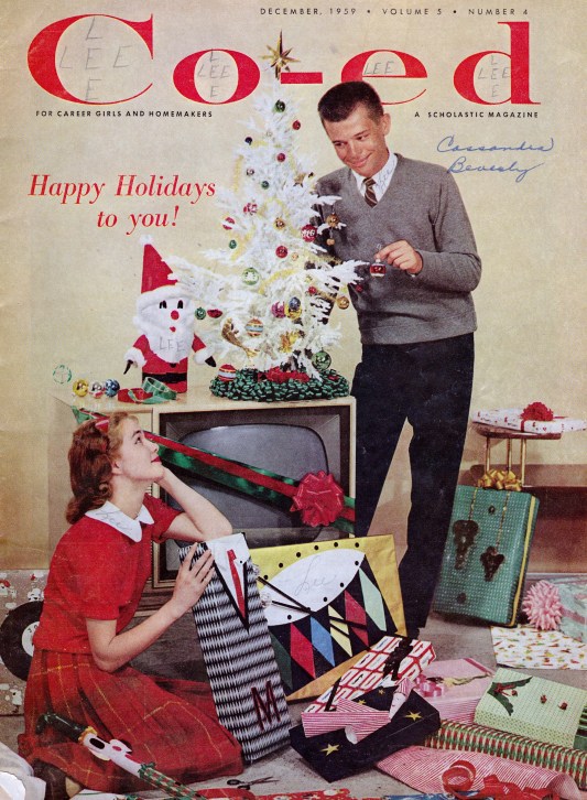 Published December 12, 2012 at 2399 × 3270 in Teen ‘Zine Scene: Co-Ed, December 1959 coed1 This girl sure enjoys watching her fella hang his balls on the tree. Notice the creative gift-wrapping ideas. Sure, they’re corny, but with some minor updates, I bet they would take Pinterest by storm. Next →