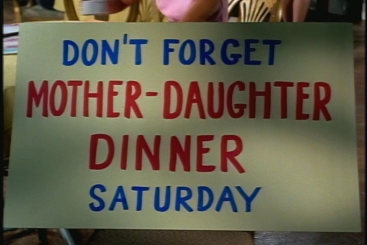 Published December 29, 2012 at 720 × 480 in Family Affair Friday(ish): Episode 16, “That Was the Dinner That Wasn’t,” 1/9/1967 mother daughter dinner sign Oh. Ouch. Next →