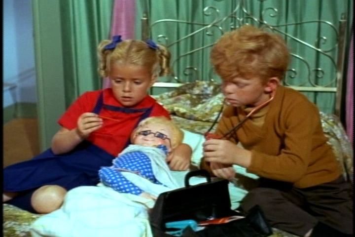 Finally, Mrs. Beasley emerges after a successful surgery. Back at home, the kids play hospital with her. This being the ’60s, Jody is the doctor and Buffy is the nurse, of course.