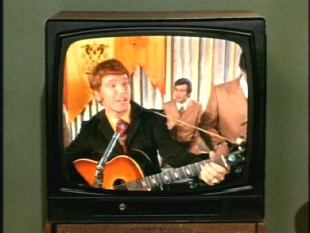 Because Cissy and the singer’s bearded manager are sitting in a Family-Affair-green office and watching him, too.