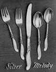 All the way through at least the 1970s, teen magazines included ads aimed at brides-to-be. In this silver pattern, “each piece curves toward the plate–the curve accentuated by the graceful swirled design.” Premium available for $1: “A solid sterling pin in Silver Melody, made like a miniature spoon.”