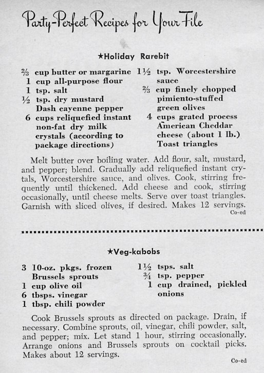 Published December 12, 2012 at 1102 × 1558 food1 Of course, your menu is paramount. What could be more Christmasy than a processed-cheese-based dish festooned with pimento-stuffed green olives. Skewered Brussels sprouts and pickled onions make a nice accompaniment.