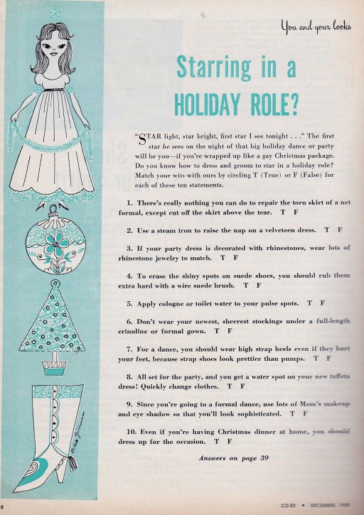 No teen magazine is complete without a quiz. This one on holiday fashion is pretty tough. I’ve learned that full-length crinolines snag stockings about the ankles, you should never wear more than 3 points of jewelry at one time, and that “Christmas is a festive time and your family deserves your very best. Rise to the occasion by wearing a pretty and spanking clean dress or skirt and blouse.” (Well, I did intend to wear something clean.)